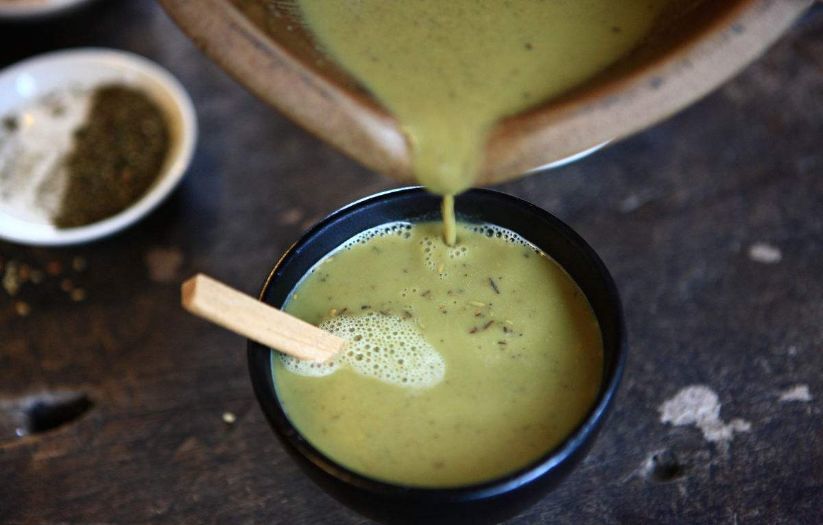 用锅煮好茶,茶槌登场。这是一根天然弯曲近似90°的茶树枝干,用来把茶汤里的茶叶捻碎,释放里头的营养物质,再与老姜、猪油和蒜在茶汤中混合出一股浓香。