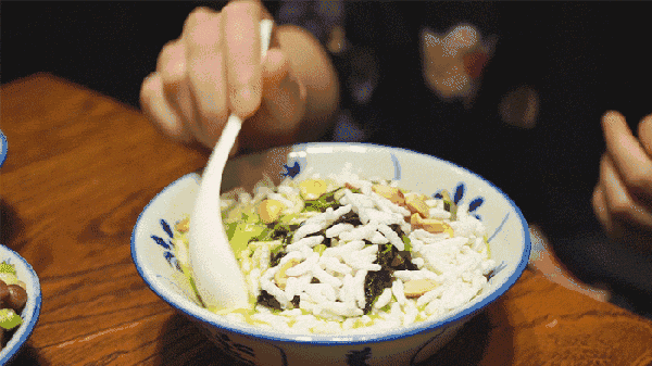 紧接着,再用竹篾篦子把残渣过滤掉,汤水干净的油茶就可以上桌了。此时,桌上的小碗简直是“乱花渐欲迷人眼”——有切好的小葱、香菜、蒜子,有花生米、炒米花、油果、馓子,有芋头粑、南瓜粑、白糍粑等各色小吃。佐料小食依个人口味添加享用,每个人都有自主权,绝不会为了“碗里怎么有香菜”这种事情而苦恼。